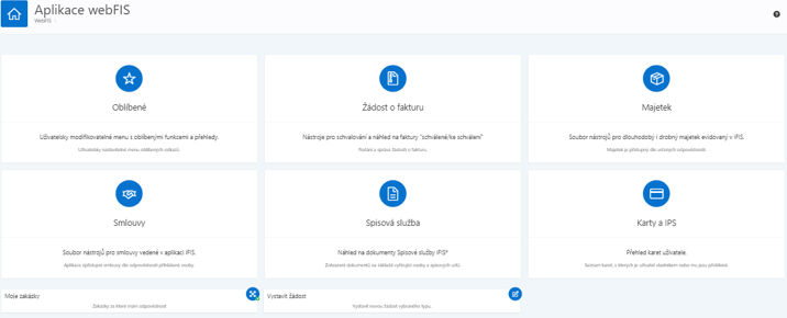 Rozcestník je úvodní obrazovka webové aplikace webFIS po přihlášení. Slouží jako rozcestník v podobě dlaždic do jednotlivých aplikací a jejich modulů.