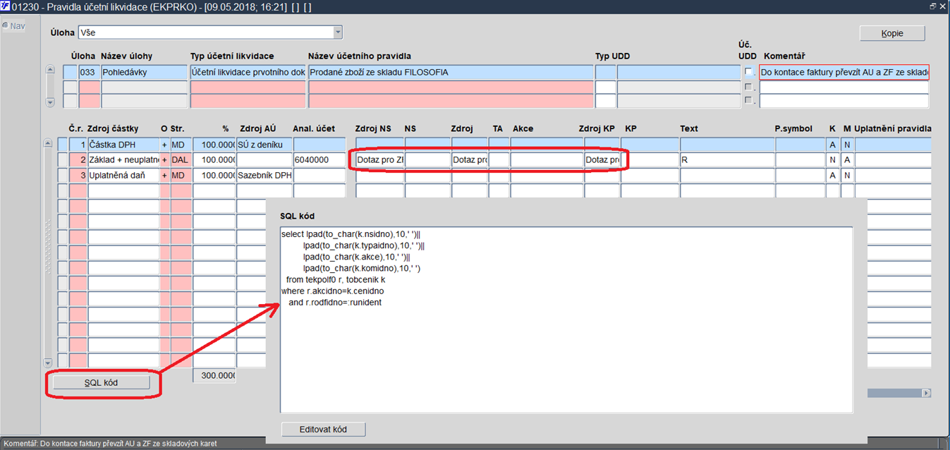 Účetní pravidlo nelze smazat, pokud existují podřízené záznamy, např. účetní pravidlo zaevidované v číselníku doplňkového salda, apod.). Před smazáním účetního pravidla je nutné nejdříve odstranit všechny existující podřízené záznamy. Ve specifických případech může správce aplikace předvyplňovat výchozí hodnoty v položkách AU, NS, TA, Akce, KP nebo TEXT pomocí SQL dotazů. >Na níže uvedeném obrázku je uveden příklad SQL dotazu pro automatické vyhledání zdroje financování na odpovídající skladové kartě a následné předvyplnění tohoto zdroje financování do předkontace pohledávkové faktury.