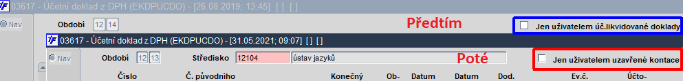 Změněn název zatržítka z Jen uživatelem účetně likvidované doklady na Jen uživatelem uzavřené kontace ve formulářích pro vytvoření účetního dokladu: