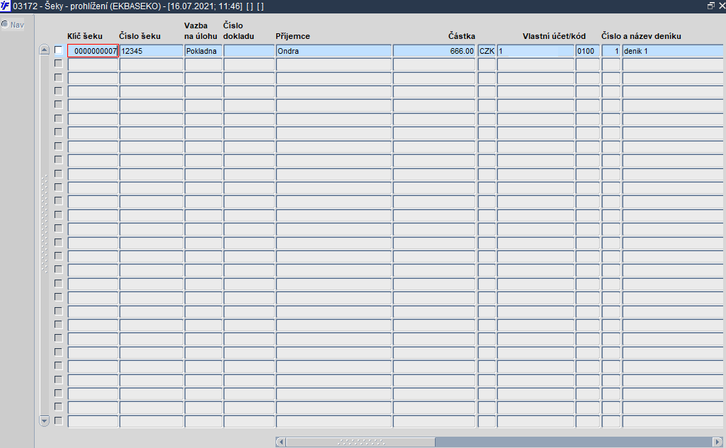 Funkce slouží jak pro prohlížení vystavených šeků, tak i k opravám či pořízení vystavených šeků. Pokud je doklad ve stavu Chybový nebo Doplněn, je možno klávesou pro výběr spustit formulář 03177 - Pořízení šeku a zde příslušný šek opravit. Pokud je však doklad ve stavu Uzavřen, je možné si ho pouze prohlížet, a to ve formuláři 03174 - Prohlížení šeku. V detailu uhrazeného šeku lze přes tlačítko v dolní části obrazovky přejít do formuláře 03122 - Prohlížení řádků bankovního výpisu a stiskem klávesy Výběr do formuláře 03123 - Řádek bankovního výpisu. Z boldu formuláře lze pomocí zatržítek označit záznamy, které mají být vytištěny sestavou 00316 - Soupis předávaných šeků do banky.