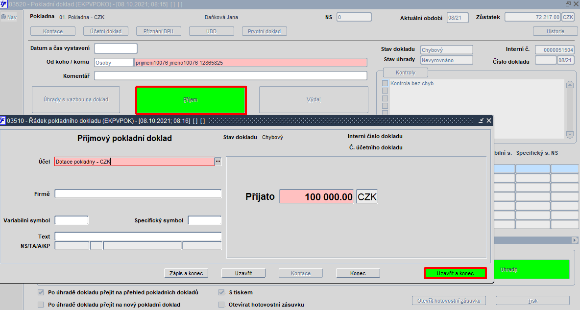 - Uzavřít a konec - zelené tlačítko uzavře pokladní doklad a ukončí práci s formulářem