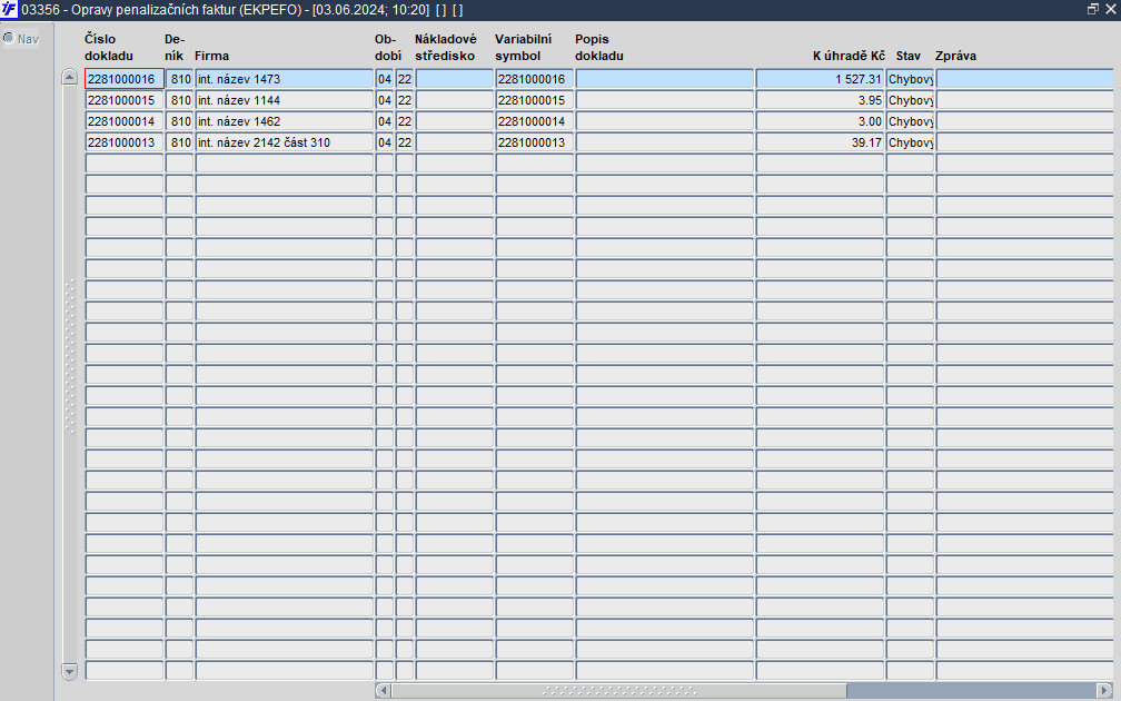 Obr. 03356/1 Opravy penalizačních faktur - spuštěno z funkce 03355 - Podklady pro penalizaci - výběr deníku pro penalizaci