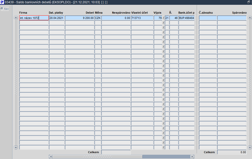 Formulář slouží pouze k prohlížení řádků bankovních výpisů. V levé části obrazovky jsou nabízeny řádky bankovních výpisů mající částku na straně Debet. Tyto řádky musí být spárovány s nějakým závazkem. Jejich položky se nevejdou do příslušné části obrazovky, proto levá polovina obrazovky roluje po těchto položkách pomocí klávesy pro Předchozí pole. V pravé části obrazovky se objeví závazek, se kterým je řádek z levé části obrazovky spárován, až po stisku klávesy pro Další blok. Detail prvotních dokladů lze prohlížet klávesou Výběr.